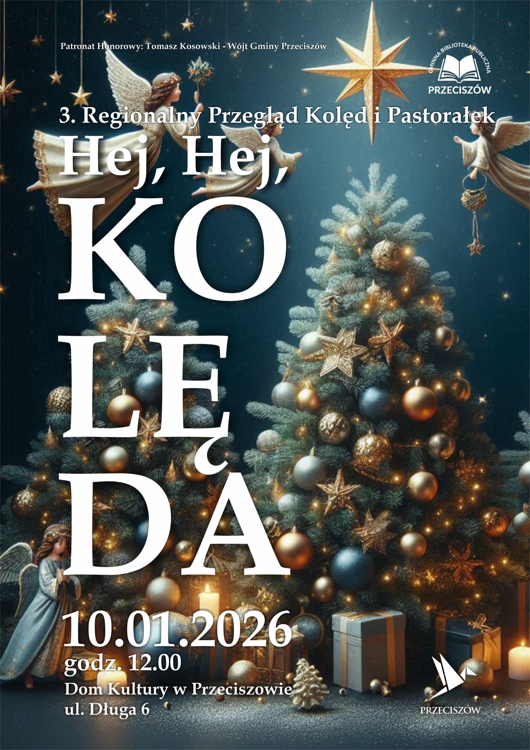 Gminna Biblioteka Publiczna w Przeciszowie jest organizatorem 3. Regionalnego Przeglądu Kolęd i Pastorałek „Hej, Hej Kolęda”, który odbędzie się w Domu Kultury w Przeciszowie w dniu 10.01.2026 roku. W wydarzeniu mogą wziąć udział zespoły ludowe, a także dzieci i młodzież działająca przy ośrodkach kultury oraz placówkach oświatowych. Gorąco zachęcamy do udziału!!!