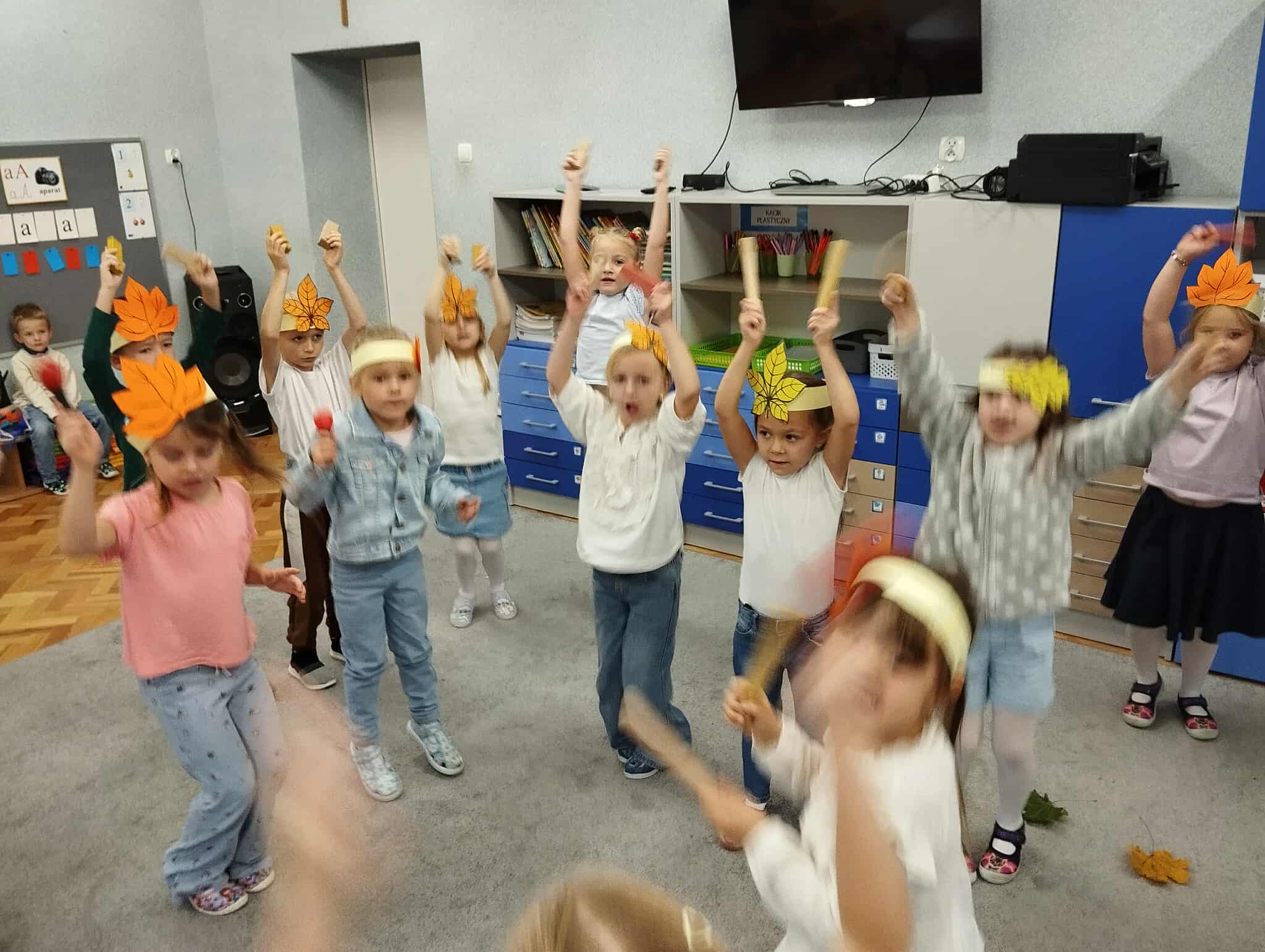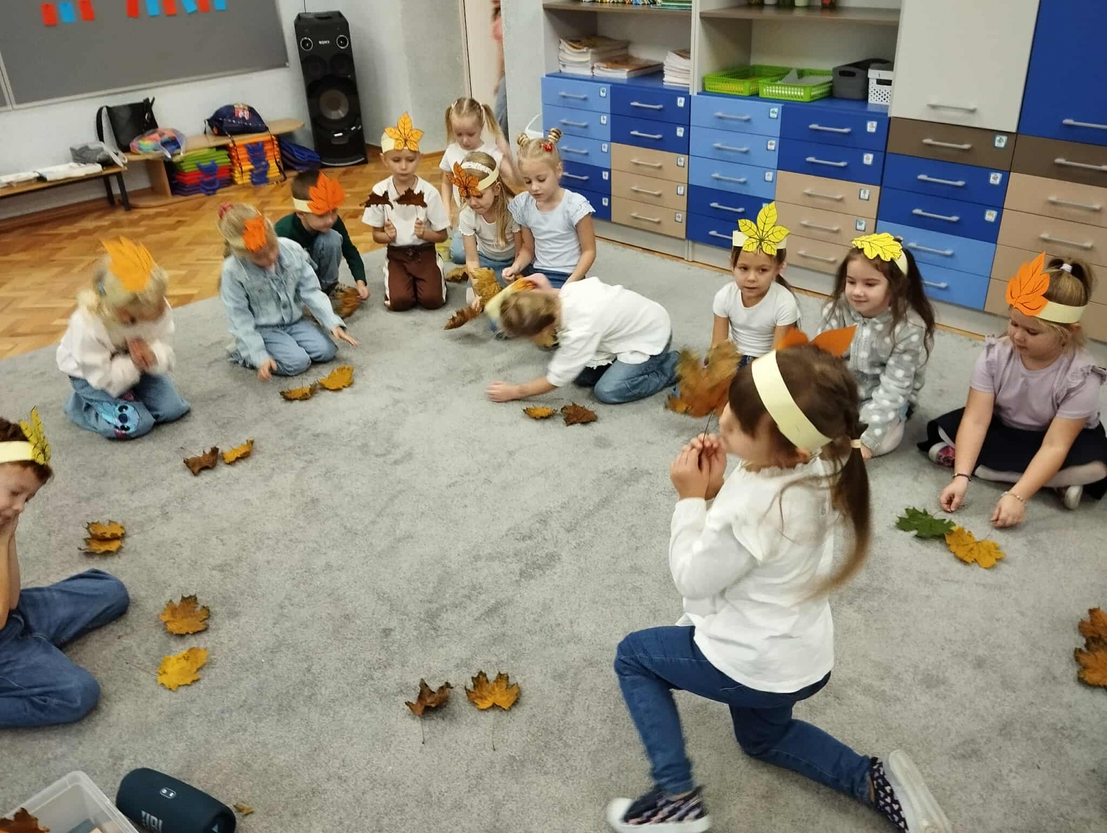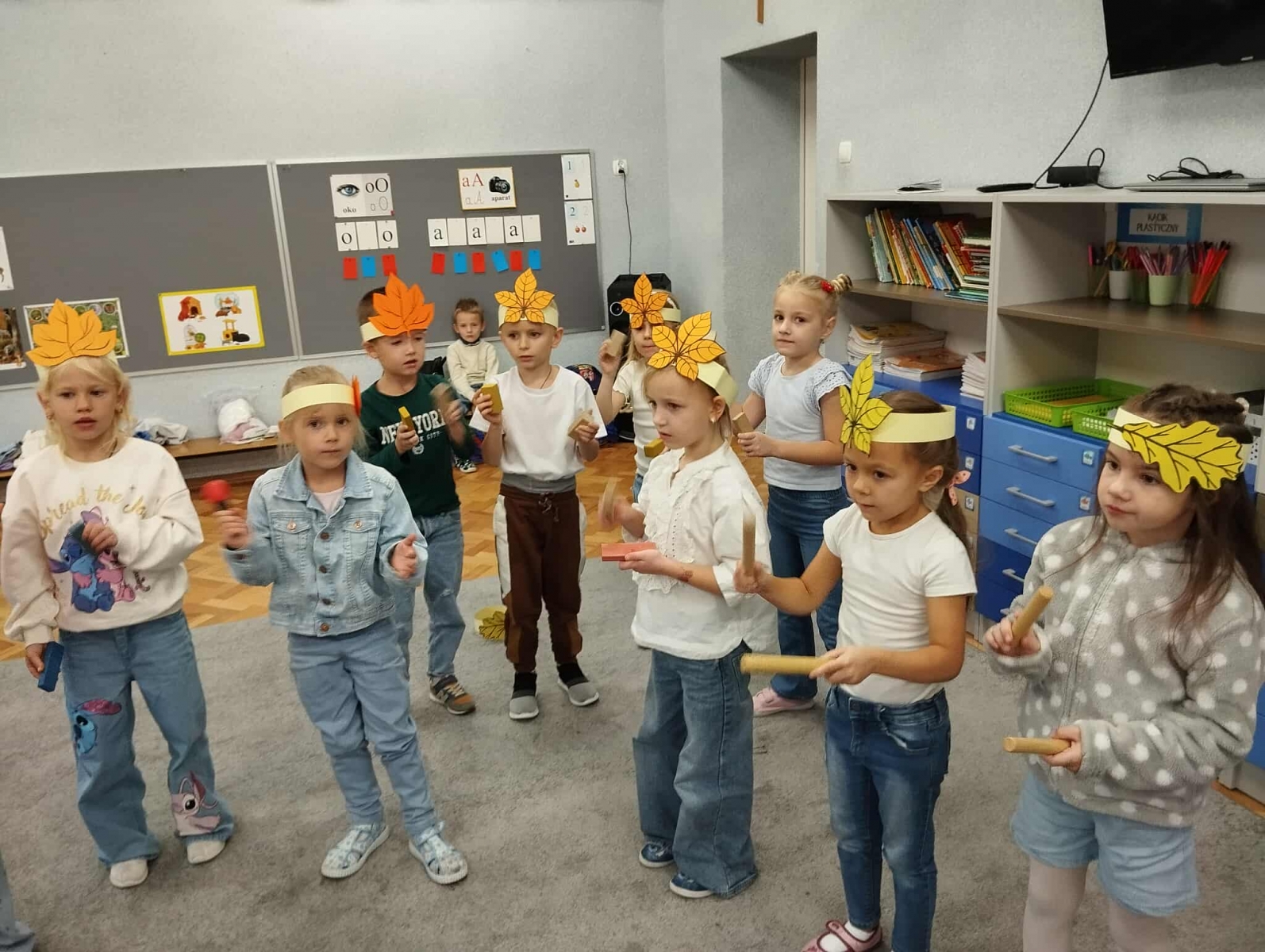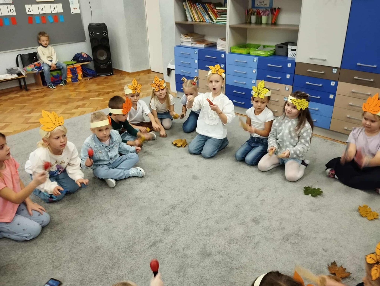 Jesienną nutką rozpoczęły się zajęcia umuzykalniające, które po przerwie wakacyjnej ponownie poprowadziła Pani Halina Czerwiec. W przedszkolu nr 2 w Przeciszowie zajęcia rozpoczęły się opowiadaniem o jesieni: z czym dzieciom kojarzy się jesień, kolory jesieni. „Kolorowe liście” to pierwsza zabawa muzyczna, która zachwyciła dzieci i wprowadziła je w jesienny nastrój, trzymając w rękach jesienne liście dzieci zgodnie z tekstem piosenki naśladowały spadające liście z drzew. Następną zabawą była piosenka „Pada deszczyk” podczas której dzieci mogły naśladować dźwięki kropelek deszczu, wystukując rytm na instrumentach rytmicznych. Najbardziej dzieciom podobała się zabawa trzecia, czyli „Idą, idą jeże”, przyniosła ona im dużo radości gdyż oprócz wystukiwania rytmów, mogły też naśladować zabawne jeżyki, które szykują się do zimowego snu.