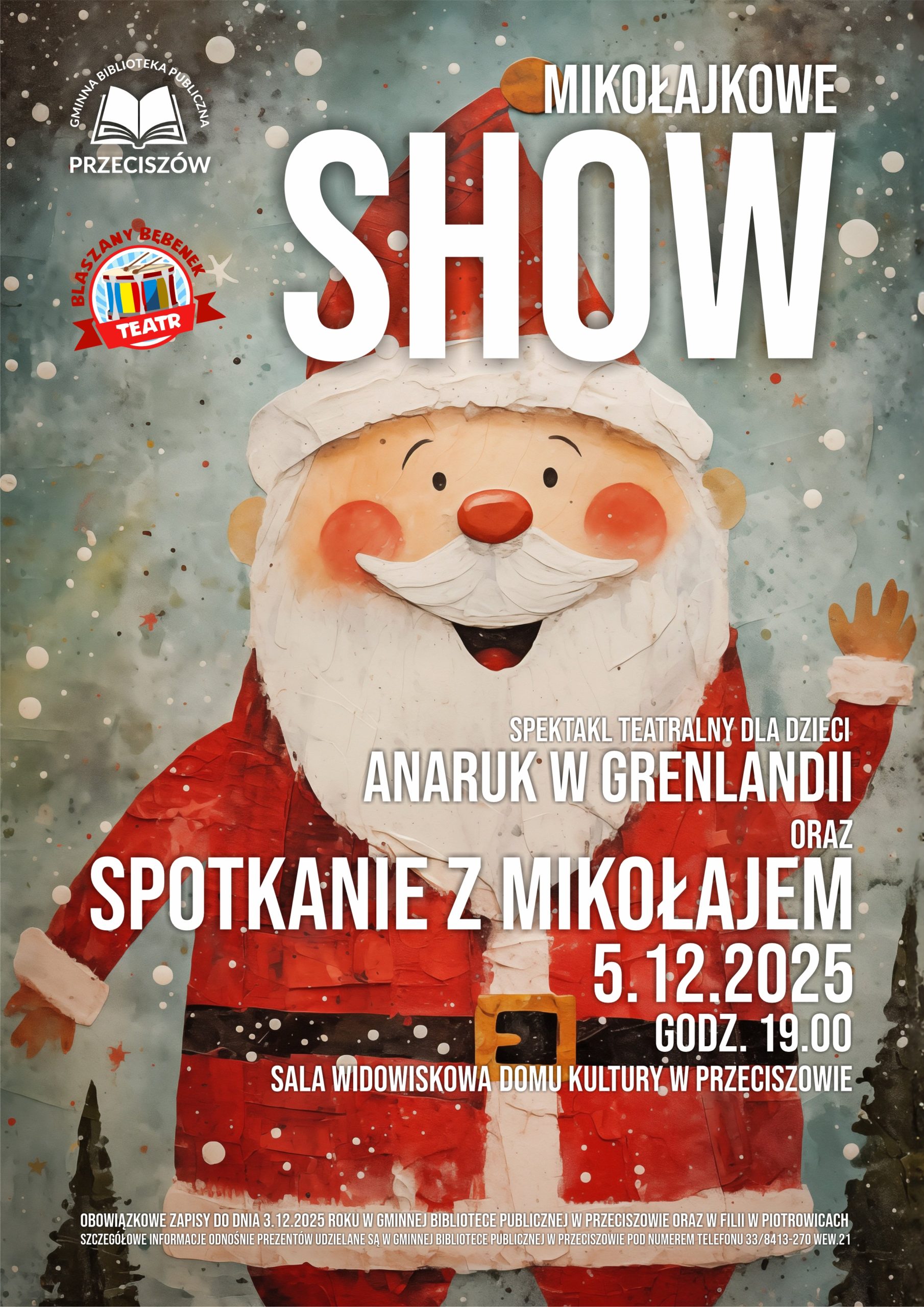 Serdecznie zapraszamy dzieci wraz z rodzicami na spektakl teatralny „Anaruk z Grenlandii” w wykonaniu teatru Blaszany Bębenek, a zaraz po nim na spotkanie z Mikołajem!!! Wydarzenie to odbędzie się na sali widowiskowej w Domu Kultury w Przeciszowie 5 grudnia o godz. 19.00. Udział jest bezpłatny. Obowiązkowe zapisy potrwają do 3 grudnia. Po szczegółowe informacje związane z prezentami zapraszamy do biblioteki w godzinach jej otwarcia, a także drogą telefoniczną (33 8413 270 wew.21) lub mailową biblioteka@gbprzeciszow.pl