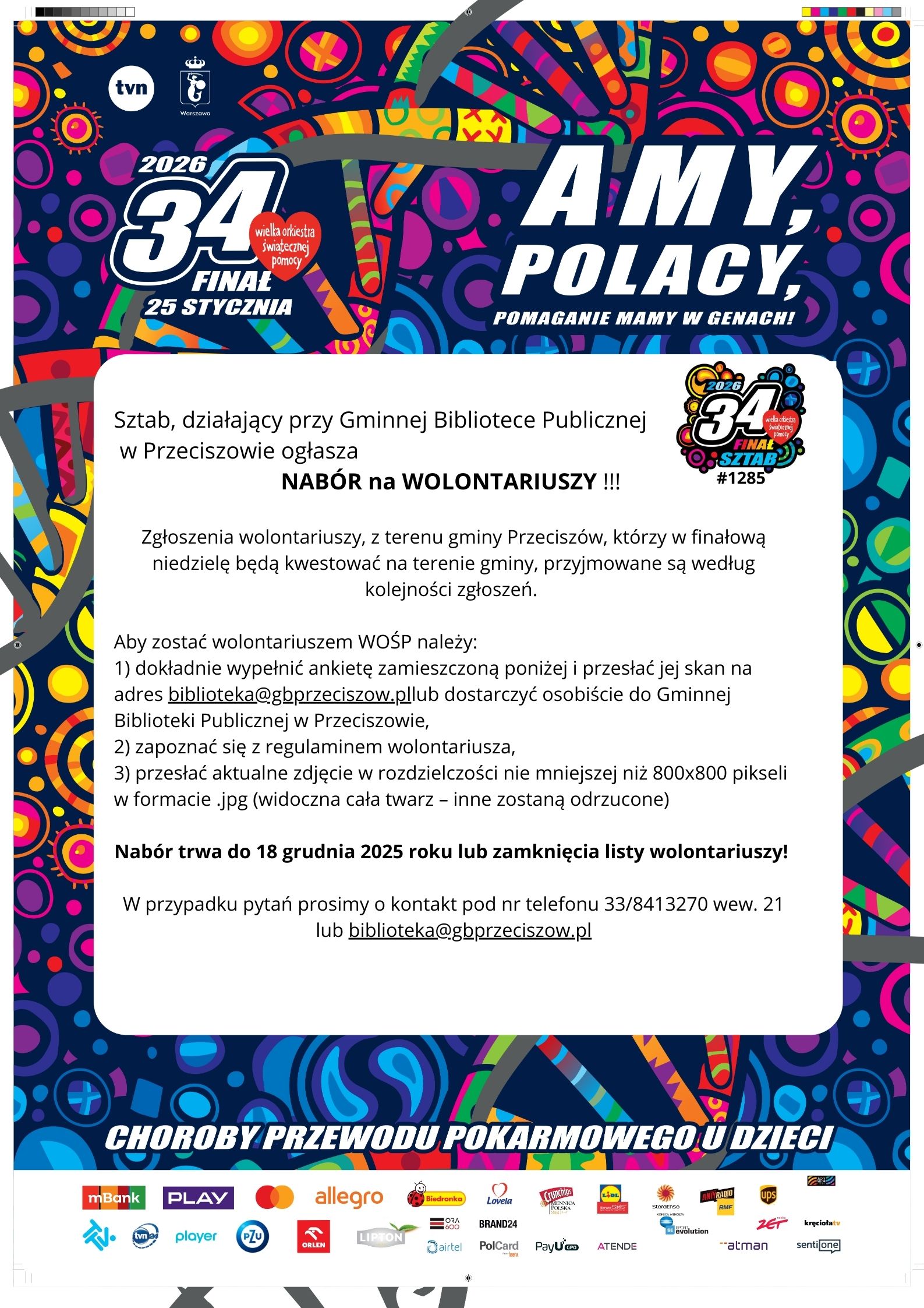 Sztab #1285 zaprasza serdecznie każdego kto zechce zostać wolontariuszem podczas 34. Finału Wielkiej Orkiestry Świątecznej Pomocy!