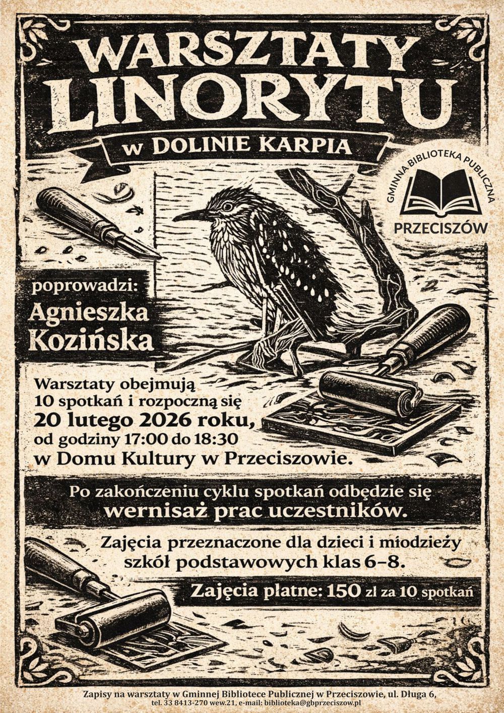 Gminna Biblioteka Publiczna w Przeciszowie ma ogromną przyjemność zaprosić dzieci i młodzież z klas 6-8 do udziału w cyklu warsztatów z linorytu.