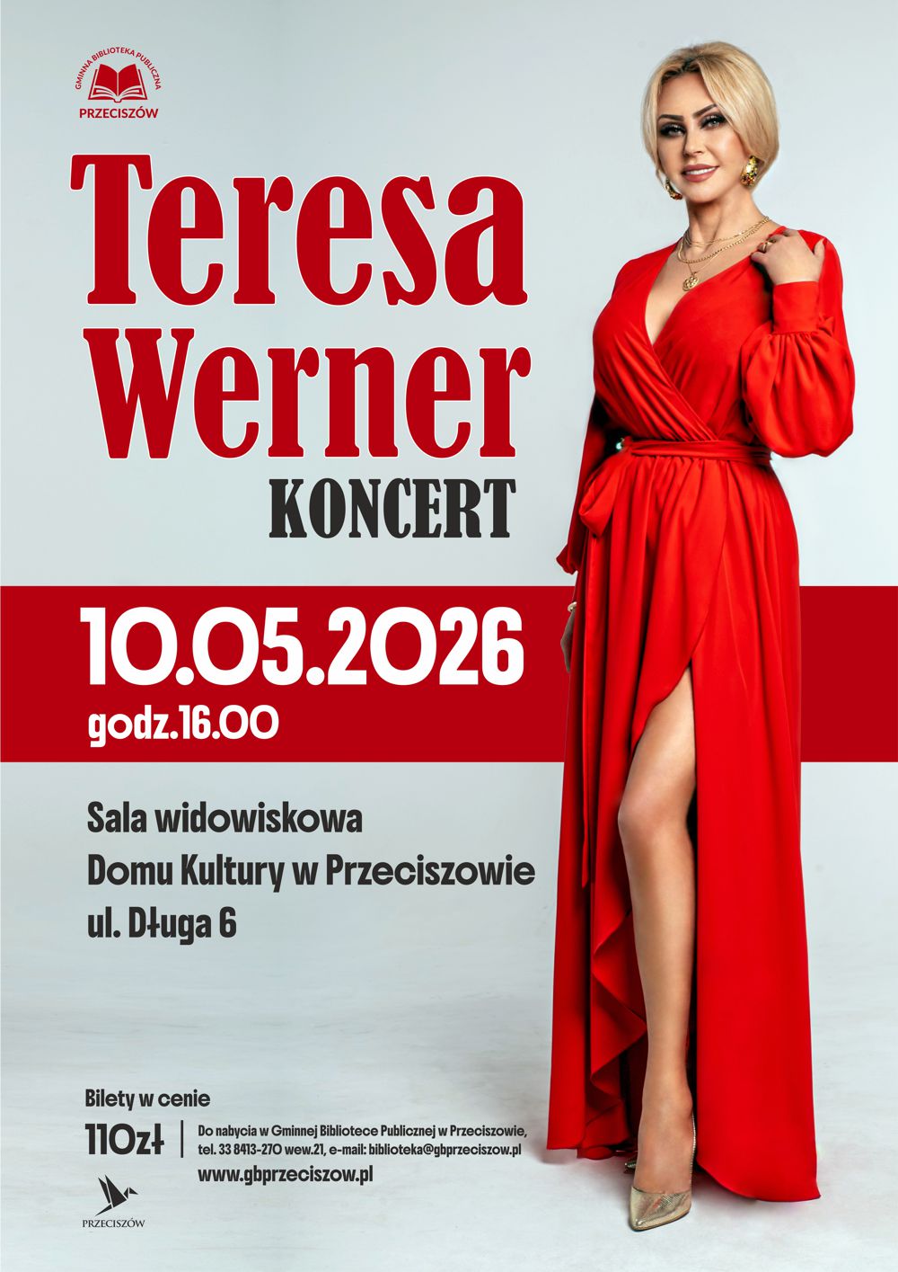 Miłośnicy pięknych melodii i nastrojowych ballad mogą już dziś zaznaczyć w kalendarzu wyjątkową datę. 10 maja 2026 roku o godzinie 16.00 w sali widowiskowej Dom Kultury w Przeciszowie odbędzie się niezwykły koncert jednej z najbardziej rozpoznawalnych artystek polskiej sceny muzycznej – Teresy Werner.