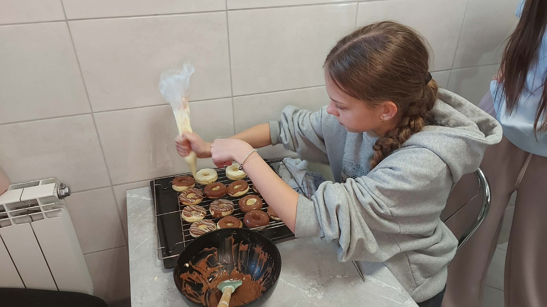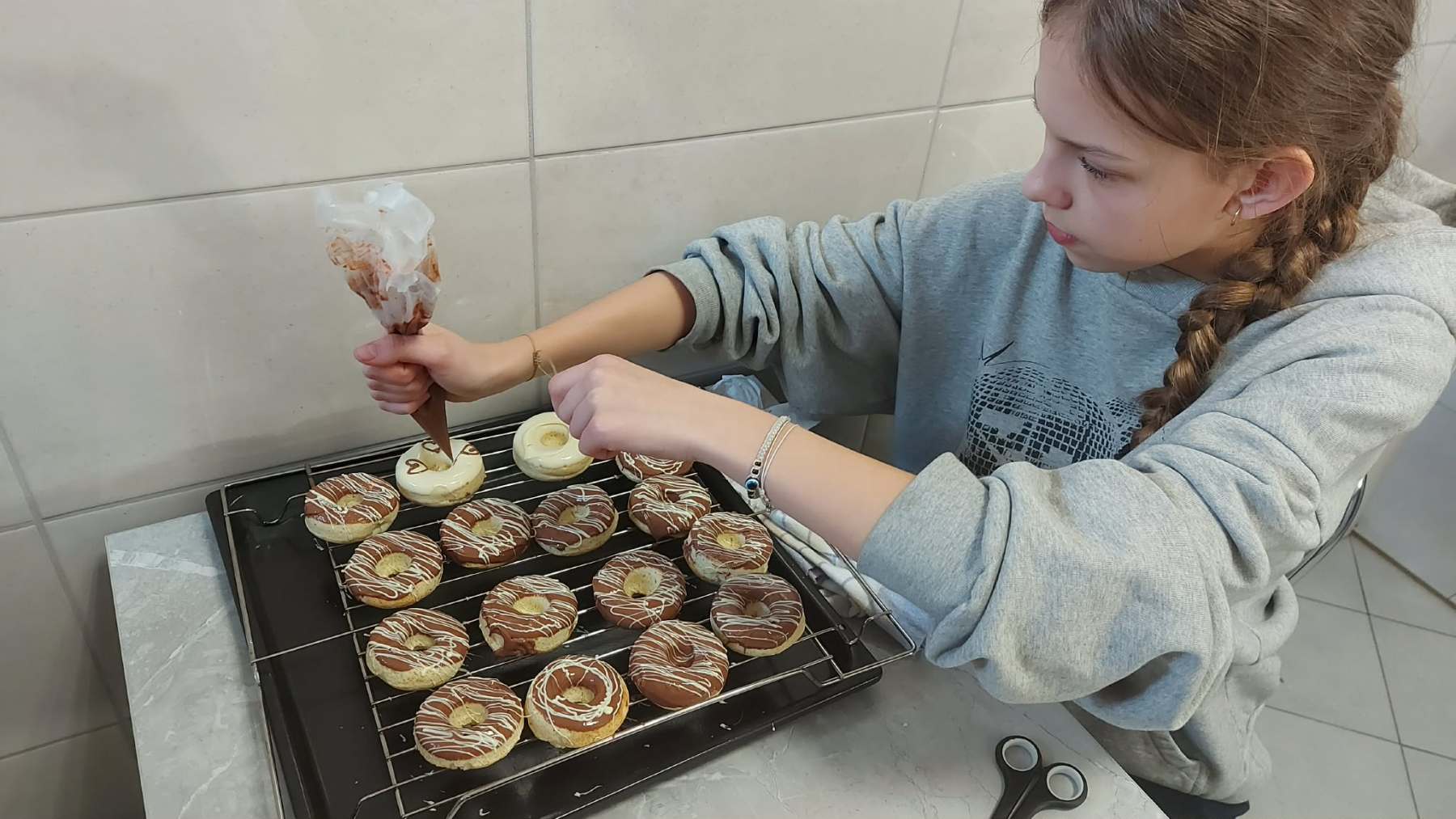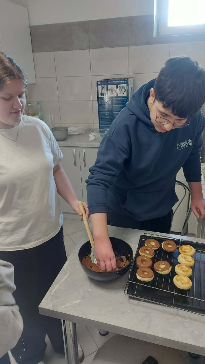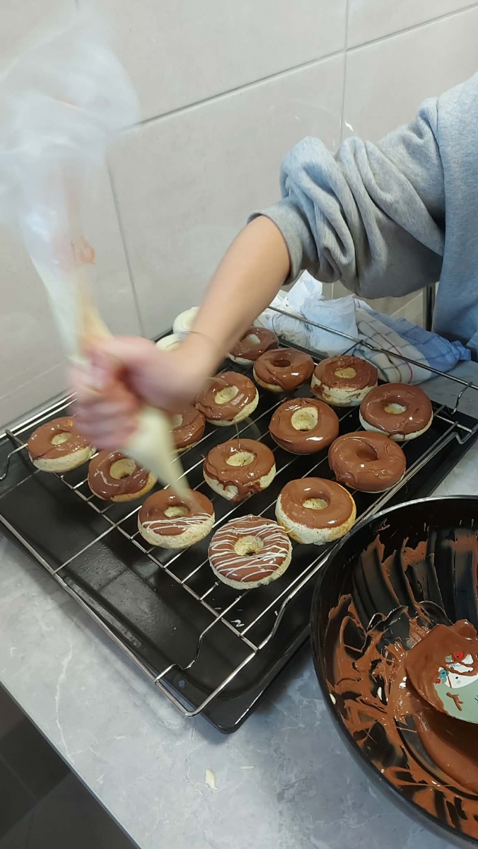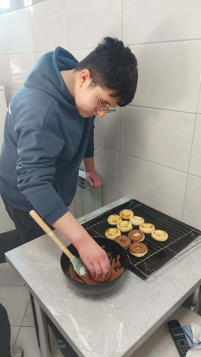 Podczas naszych ostatnich zajęć kulinarnych dzieci zamieniły się w prawdziwych mistrzów cukiernictwa! Mimo, że nie był to tłusty czwartek to i tak królowały pączki, a konkretniej donuty. Przepis szybki i prosty, ale nie ujmowało to ekscytacji z przygotowań. Gdy nasze wypieki były gotowe i troszkę ostudziły się po wyjęciu z pieca, nastąpił czas dekoracji, roztopioną w kąpieli wodnej czekoladą, bardzo profesjonalnie na pączkach pojawiły się słodkie esy i floresy, a po obowiązkowym wspólnym zdjęciu nastąpił czas próbowania, donuty zniknęły raz dwa więc nie ulega wątpliwości, że były pyszne.