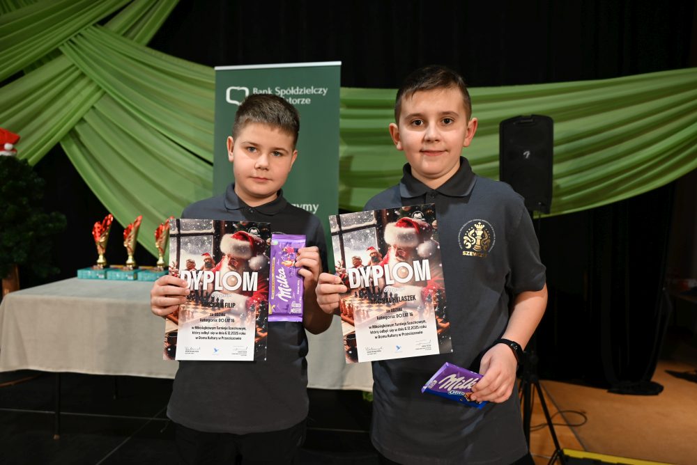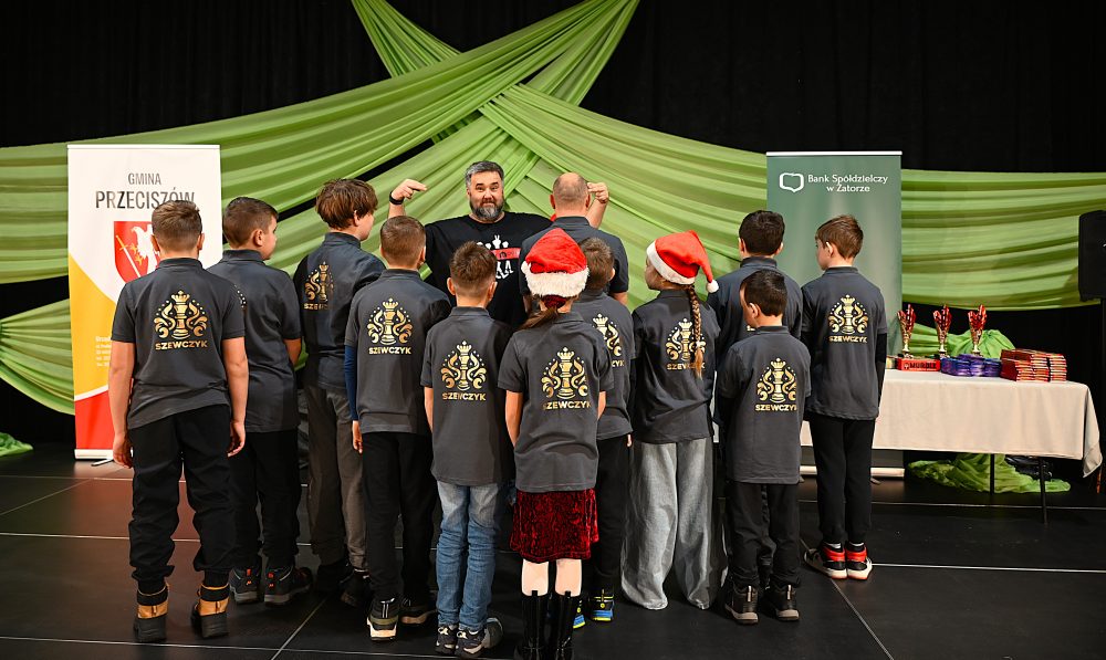 W turnieju udział wzięli również zawodnicy z sekcji szachowej „Szewczyk”, działającej przy Gminnej Bibliotece Publicznej w Przeciszowie. Zawodnicy zaprezentowali się w nowych polówkach z logo sekcji, co podkreśliło profesjonalizm i jedność drużyny. Mikołajkowy Turniej Szachowy w Przeciszowie ponownie udowodnił, że sport łączy pokolenia, a szachy – choć ciche – potrafią dostarczyć ogromnych emocji. Wydarzenie wprowadziło uczestników w magiczny okres przedświąteczny, a organizatorzy już dziś zapraszają na kolejne szachowe zmagania w Przeciszowie!