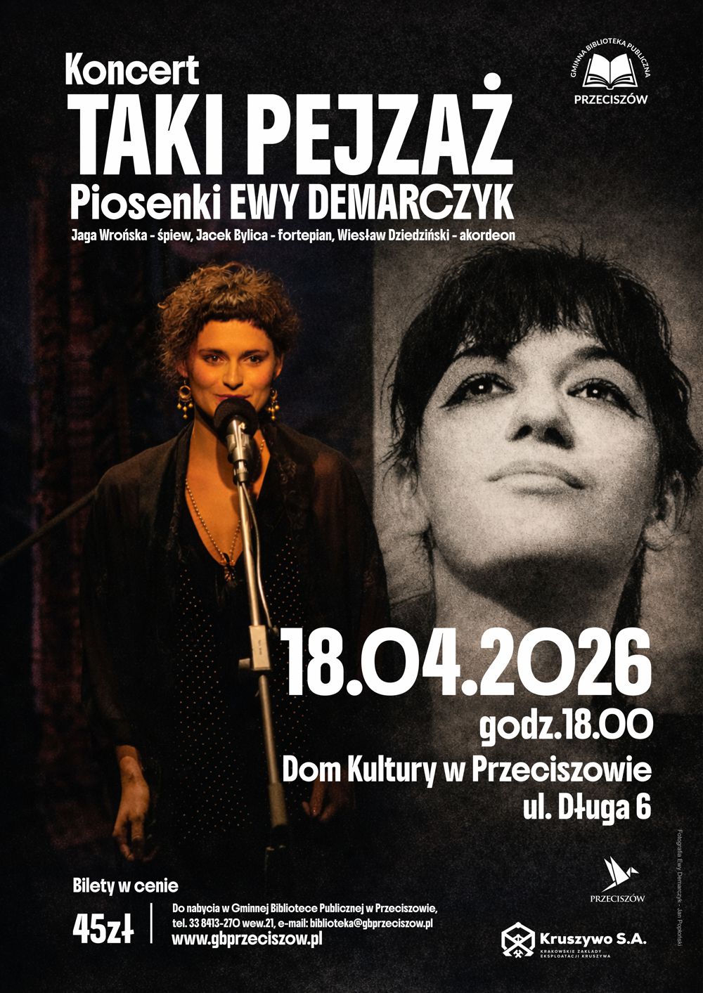 18 kwietnia 2026 roku o godzinie 18.00 sala widowiskowa Domu Kultury w Przeciszowie stanie się przestrzenią wyjątkowego spotkania z poezją, muzyką i emocją. Tego wieczoru odbędzie się koncert zatytułowany „Taki pejzaż” – piosenki Ewy Demarczyk, poświęcony twórczości jednej z najbardziej charyzmatycznych i niepowtarzalnych postaci polskiej sceny muzycznej.