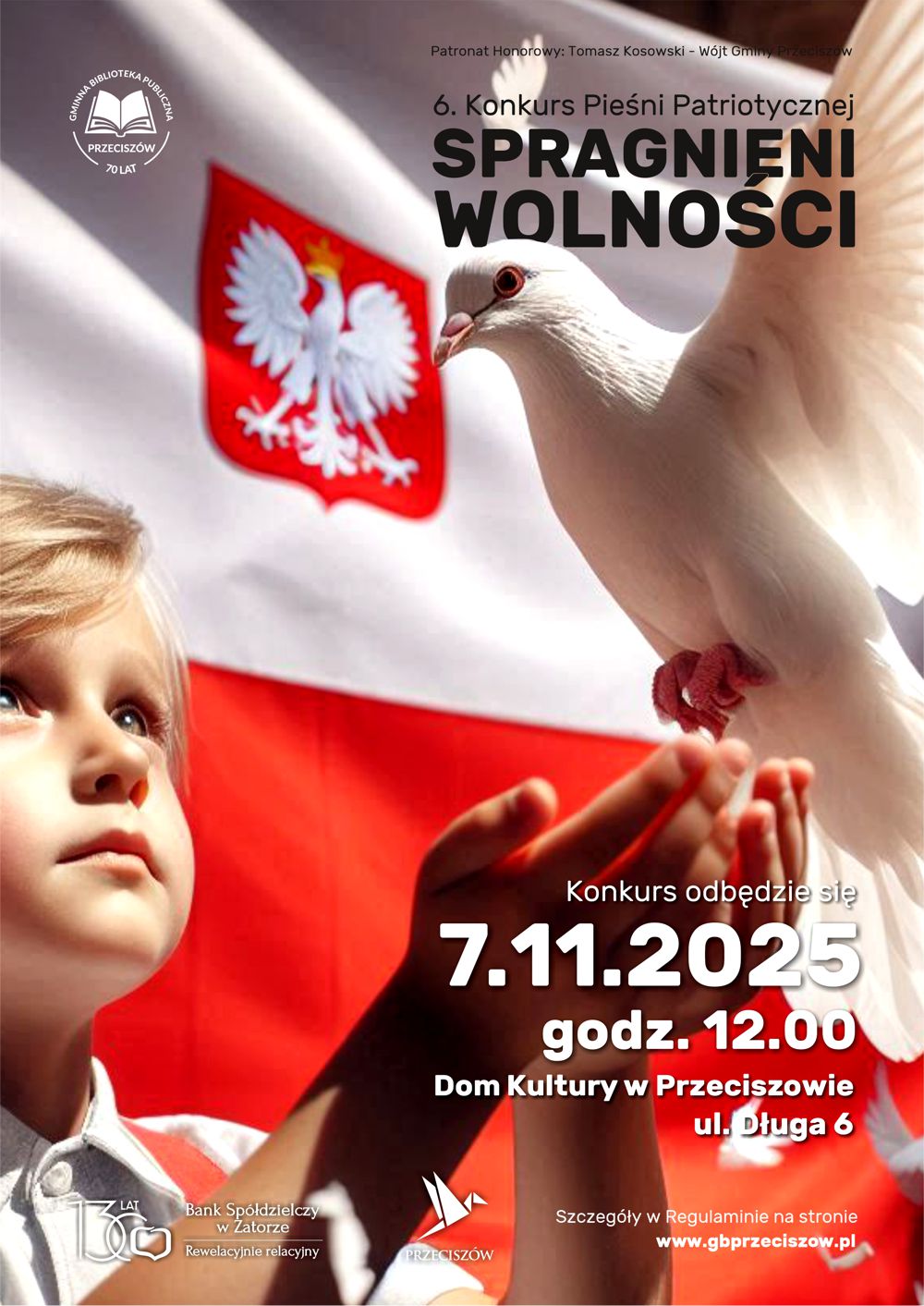 Już 7 listopada 2025 roku o godzinie 12.00 w Domu Kultury w Przeciszowie odbędzie się 6. Konkurs Pieśni Patriotycznej pod hasłem „Spragnieni Wolności”. To szczególna inicjatywa, która łączy muzykę, historię i pamięć o tych, którzy walczyli o niepodległość naszej Ojczyzny. Wydarzeniu patronuje Wójt Gminy Przeciszów – Tomasz Kosowski.