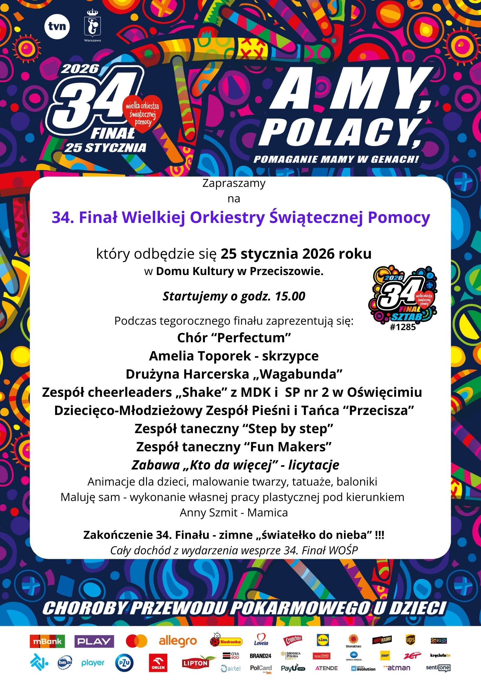 Oczywiście od rana będzie się odbywać kwesta publiczna w okolicach kościołów w naszej gminie, a od godz. 15.00 zapraszamy do Domu Kultury w Przeciszowie na finał!